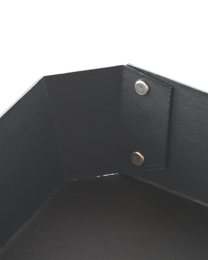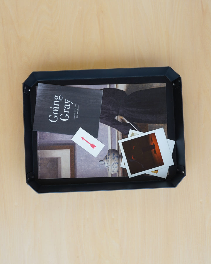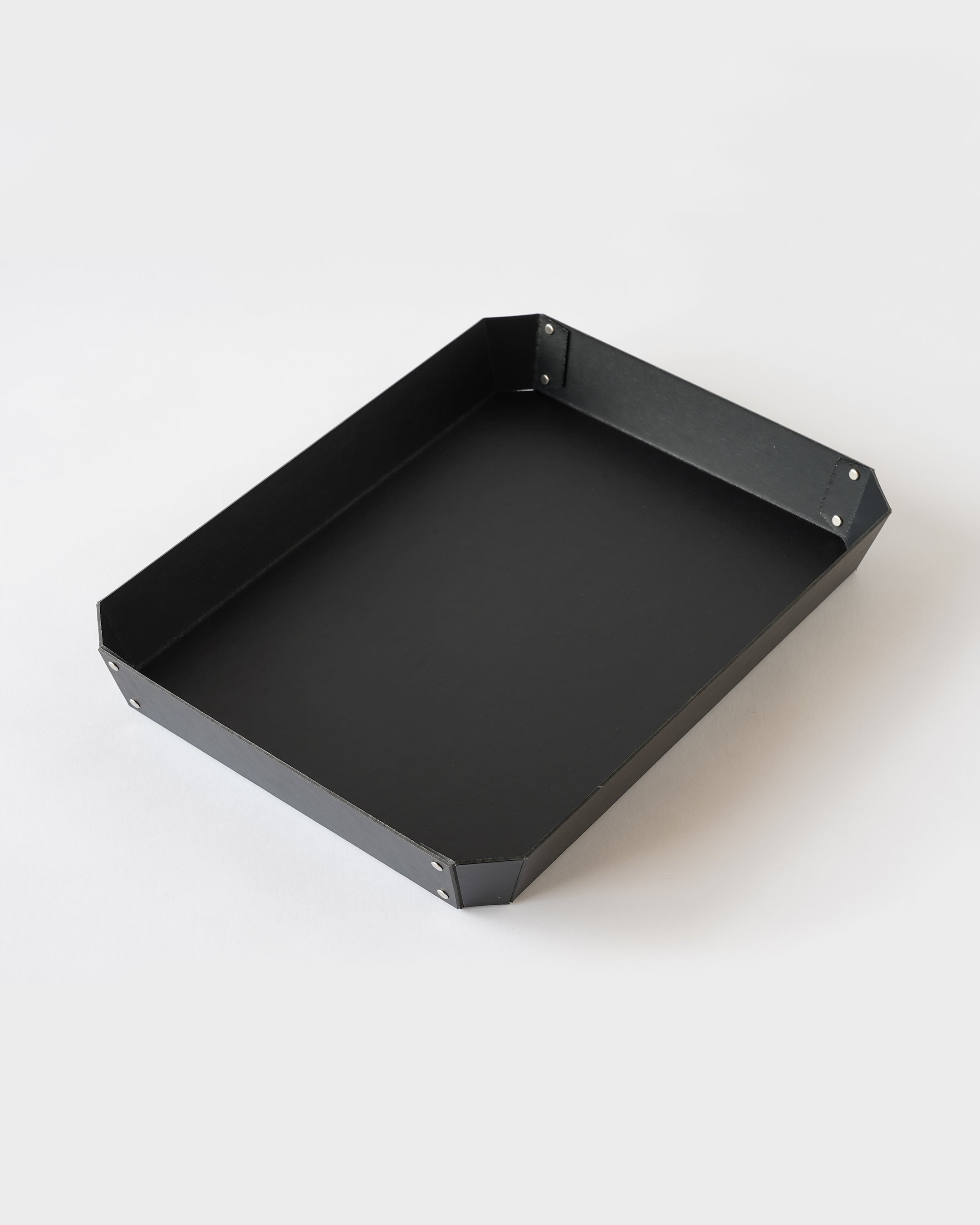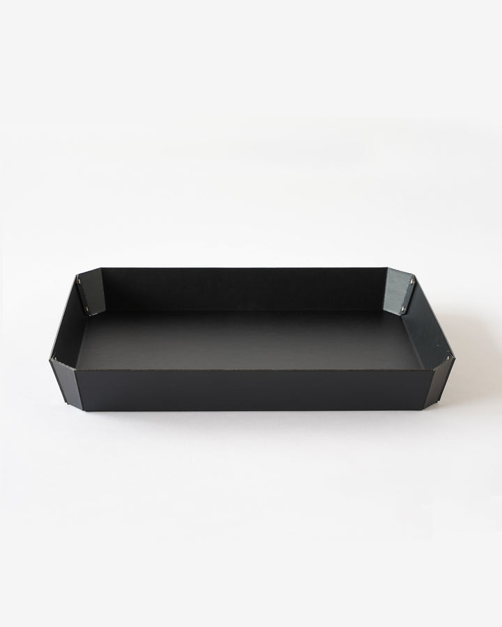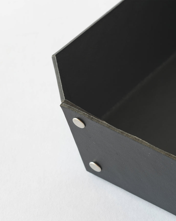 ヨーロッパで開発された繊維ボード「パスコ」を使ったトレーはcraft_oneオリジナル商品です。半切り加工を施し折り曲げて、リベットで留めたシンプルな8角形をした万能トレー。シンプルなかたちだからこそディティールにこだわり、トレー内側部分も綺麗に仕上がるよう両面リベット加工を施しています。パスコのマットな色彩に職人の手作業によりひとつひとつ丁寧に打ち込まれたシルバー色のリベットがアクセントになっております。A4の用紙も入る使いやすいサイズなので、デスク回りや雑誌、新聞など入れても良さそうです。またリビング内の小物をまとめて整理するのにも丁度良いサイズ感です。
