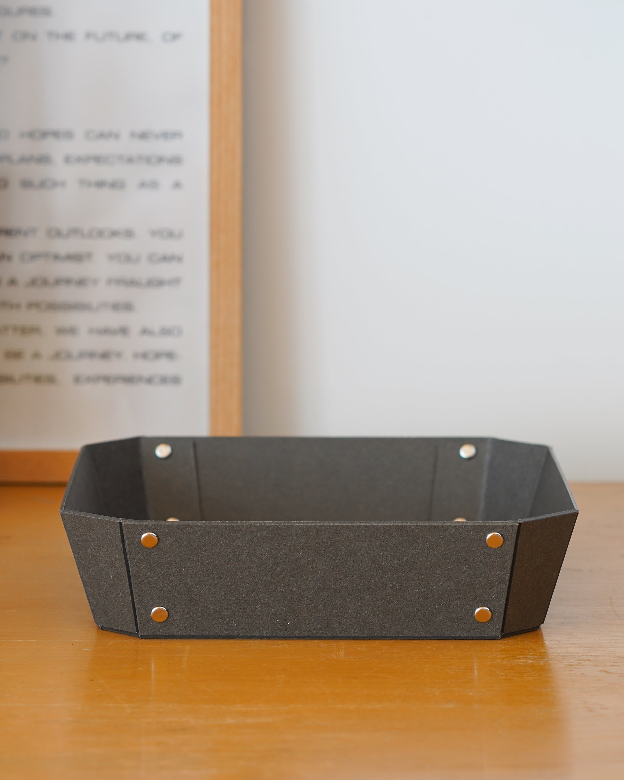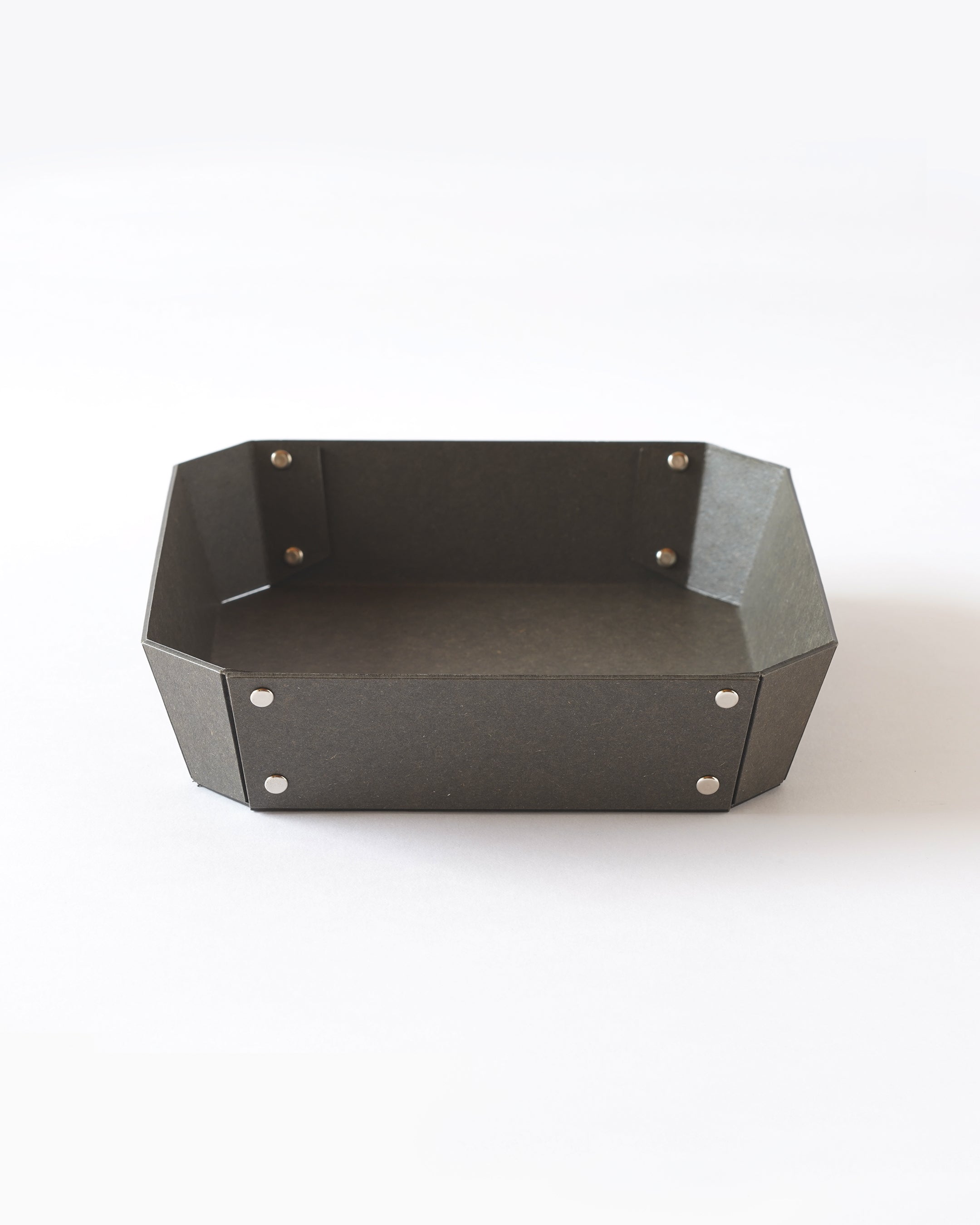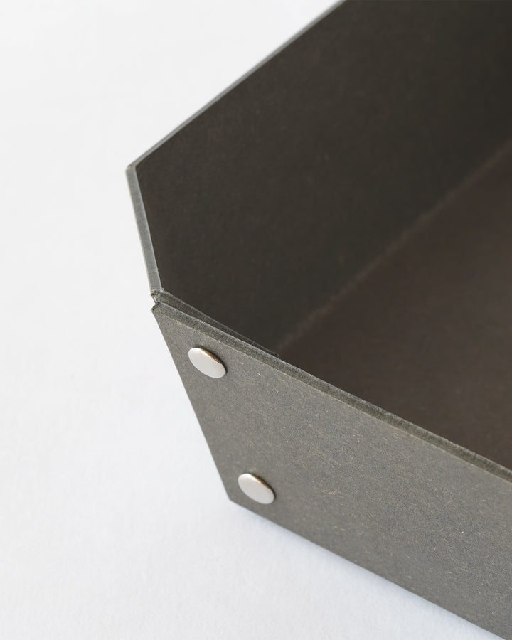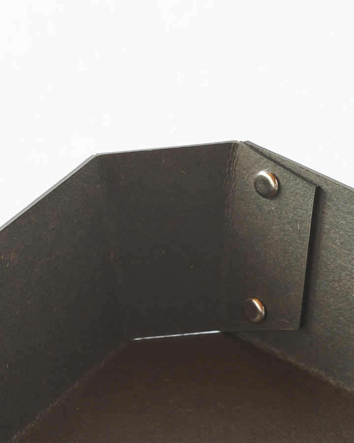 ヨーロッパで開発された繊維ボード「パスコ」を使ったトレーはcraft_oneオリジナル商品です。半切り加工を施し折り曲げて、リベットで留めたシンプルな8角形をした万能トレー。シンプルなかたちだからこそディティールにこだわり、トレー内側部分も綺麗に仕上がるよう両面リベット加工を施しています。パスコのマットな色彩に職人の手作業によりひとつひとつ丁寧に打ち込まれたシルバー色のリベットがアクセントになっております。玄関やリビング、デスク回りなどのちょっとした小物を入れるのに丁度良いサイズです。
