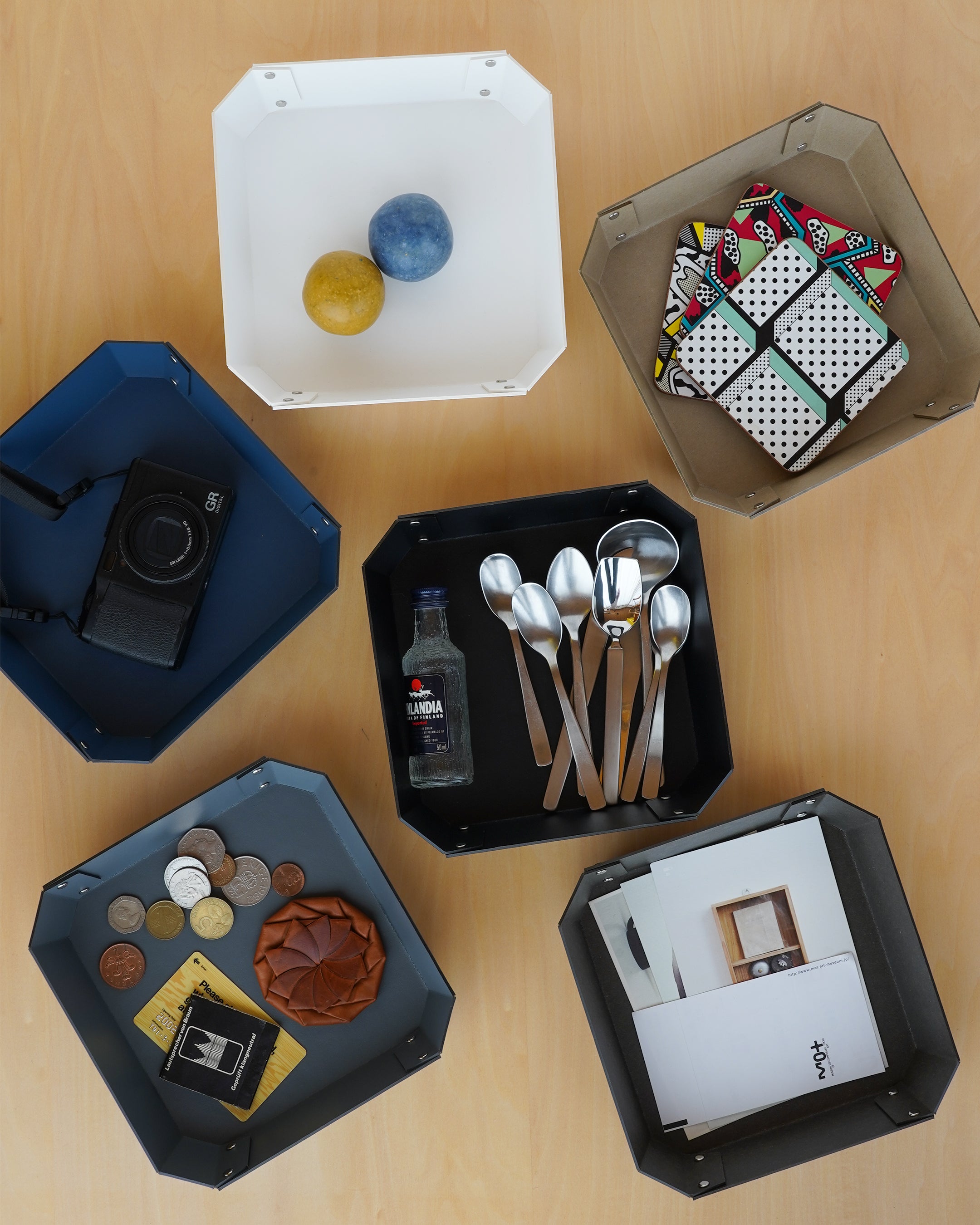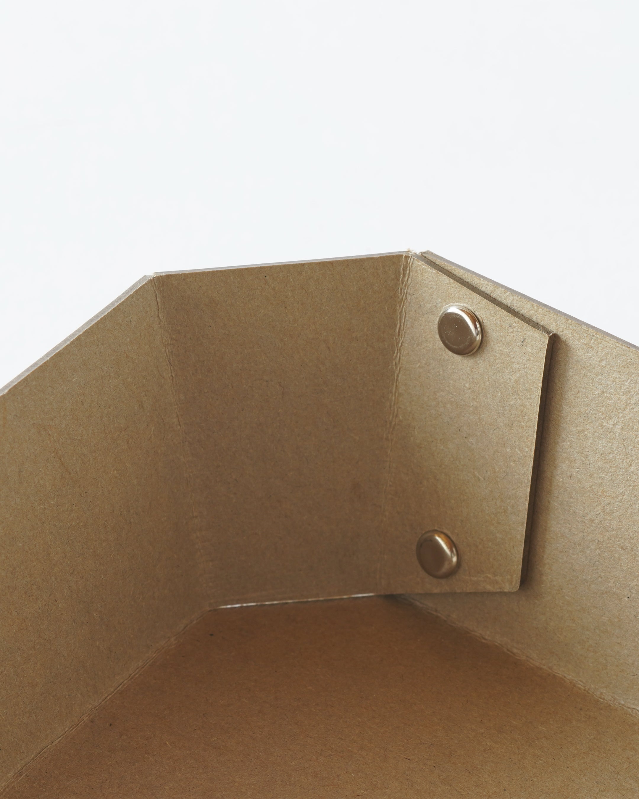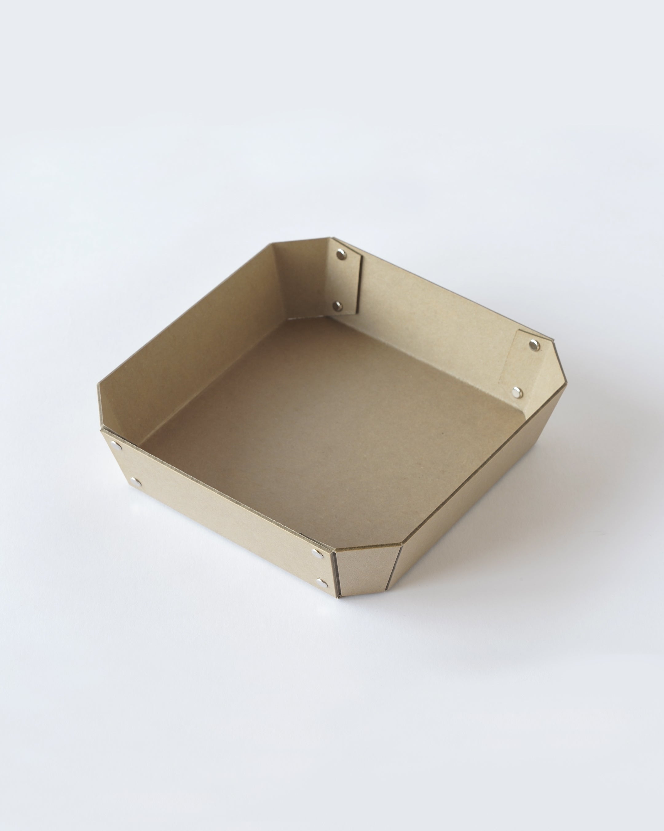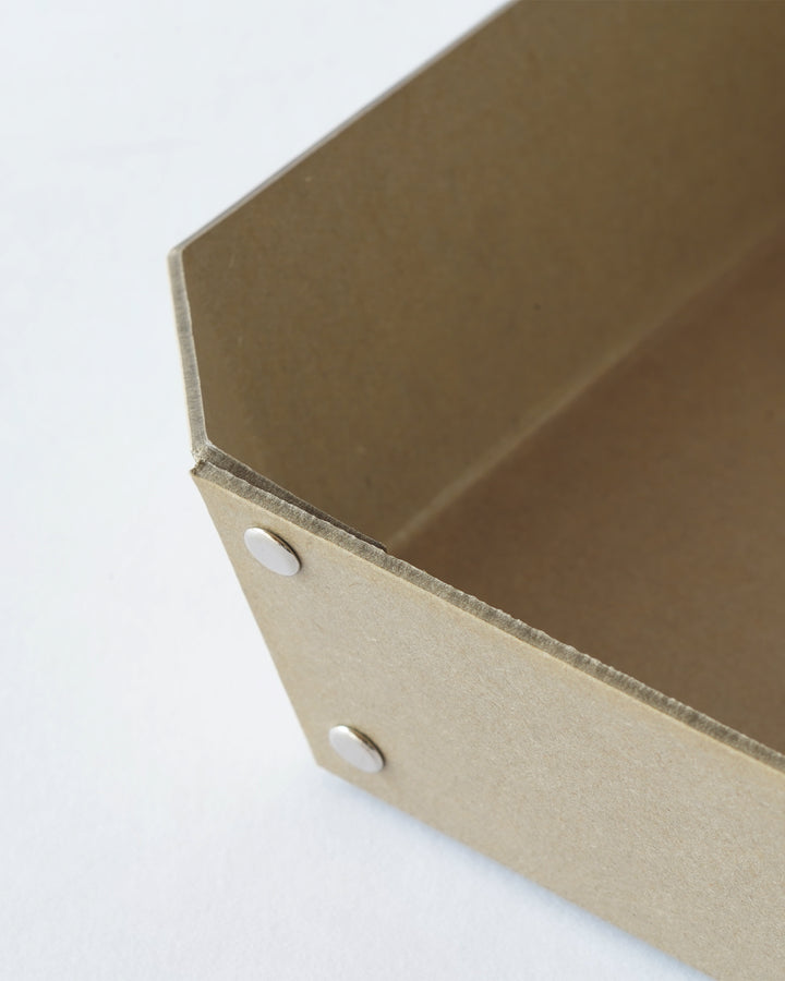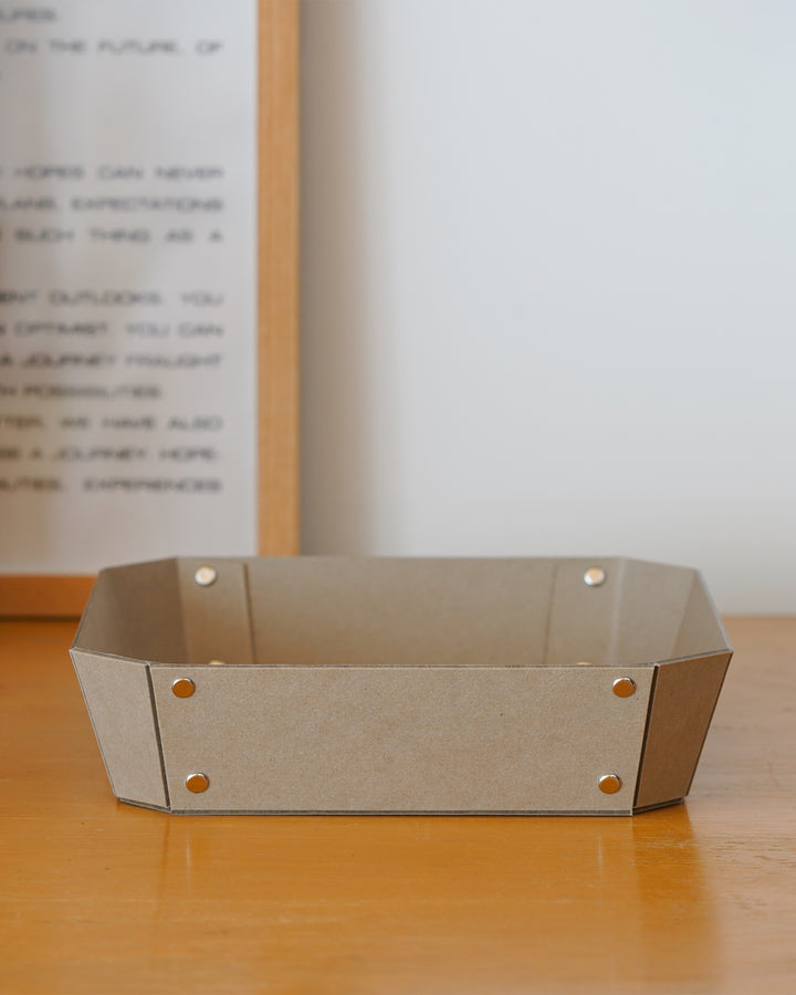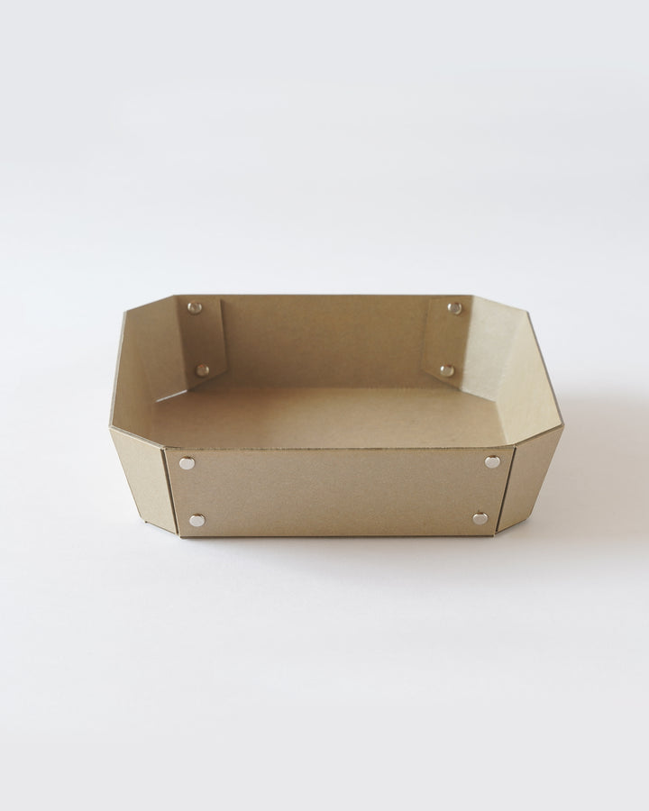 ヨーロッパで開発された繊維ボード「パスコ」を使ったトレーはcraft_oneオリジナル商品です。半切り加工を施し折り曲げて、リベットで留めたシンプルな8角形をした万能トレー。シンプルなかたちだからこそディティールにこだわり、トレー内側部分も綺麗に仕上がるよう両面リベット加工を施しています。パスコのマットな色彩に職人の手作業によりひとつひとつ丁寧に打ち込まれたシルバー色のリベットがアクセントになっております。玄関やリビング、デスク回りなどのちょっとした小物を入れるのに丁度良いサイズです。