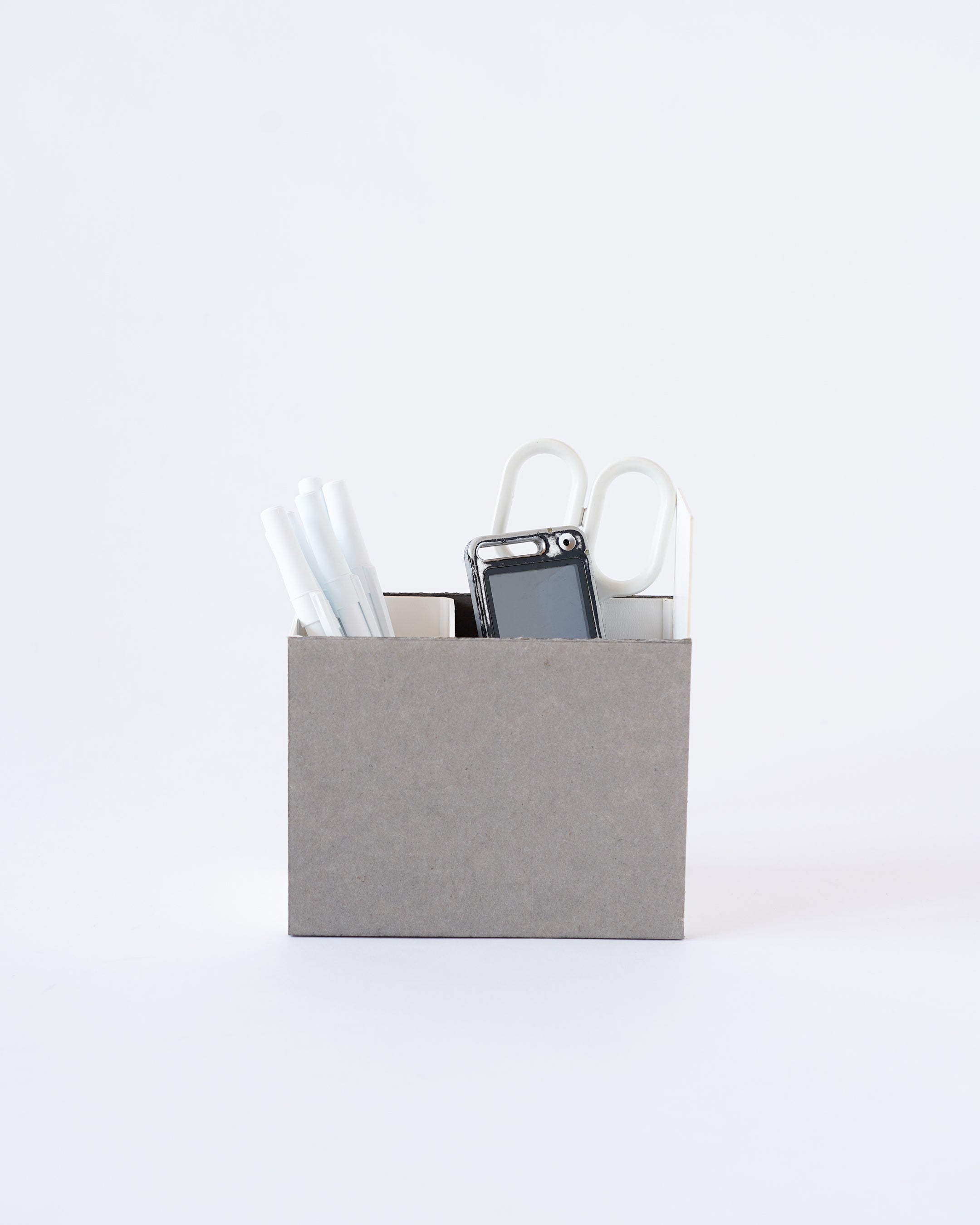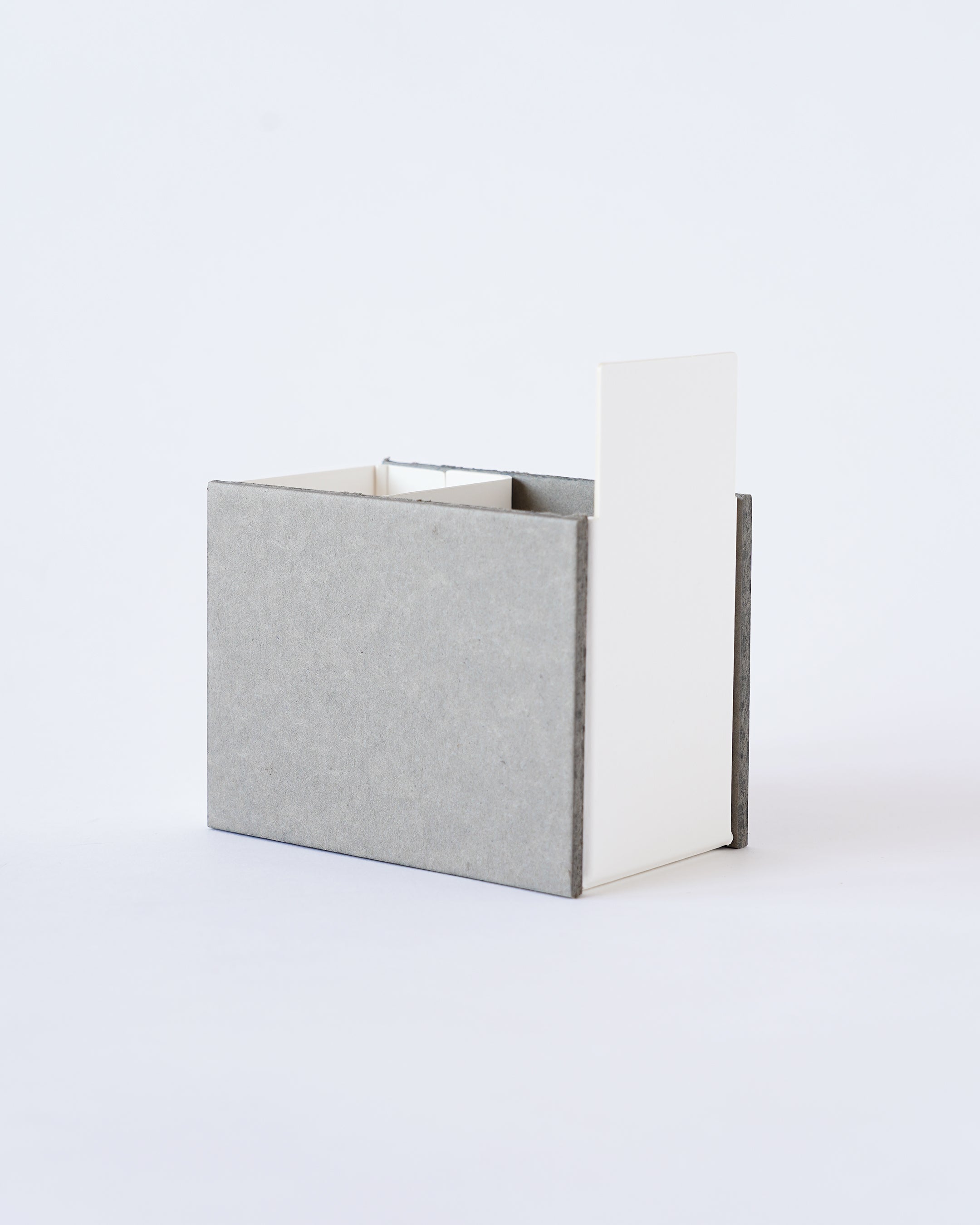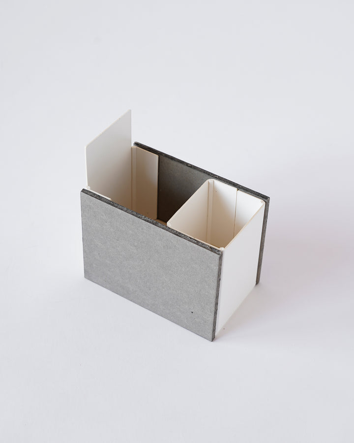 2種類の異なるパスコを張り合わせ組み立てたツールボックスです。「パスコ」とはヨーロッパで開発されたリサイクル可能な紙製繊維ボード。同種類でありながら厚みや色が異なる事により、木やプラスチック、スチールなどでは表現できない質感を表現。仕切りが設けられているので、散らばりがちなリモコンやペン類などをまとめて収納ができます。挟み込んだ厚さ5ミリのパスコは安定感もあり、端部にちょっとした取っ手がありますので持ち運びにも便利です。
