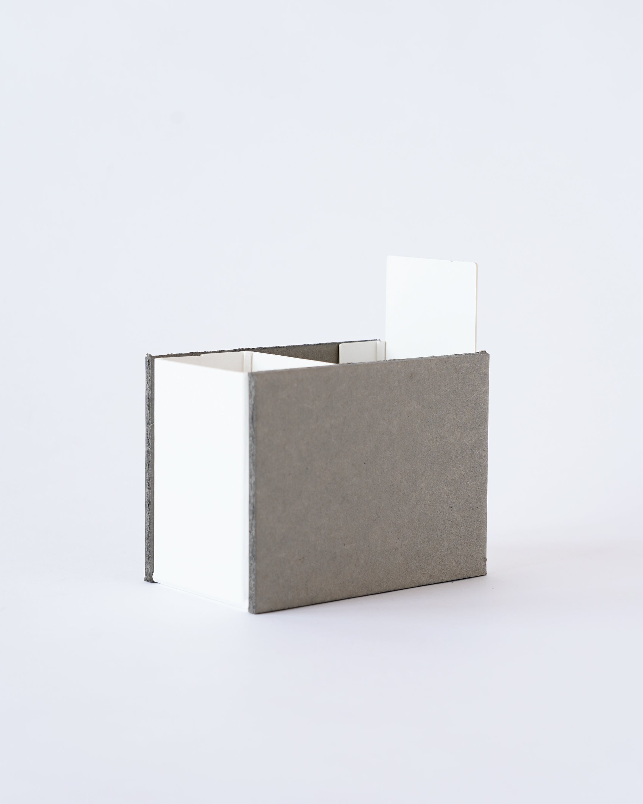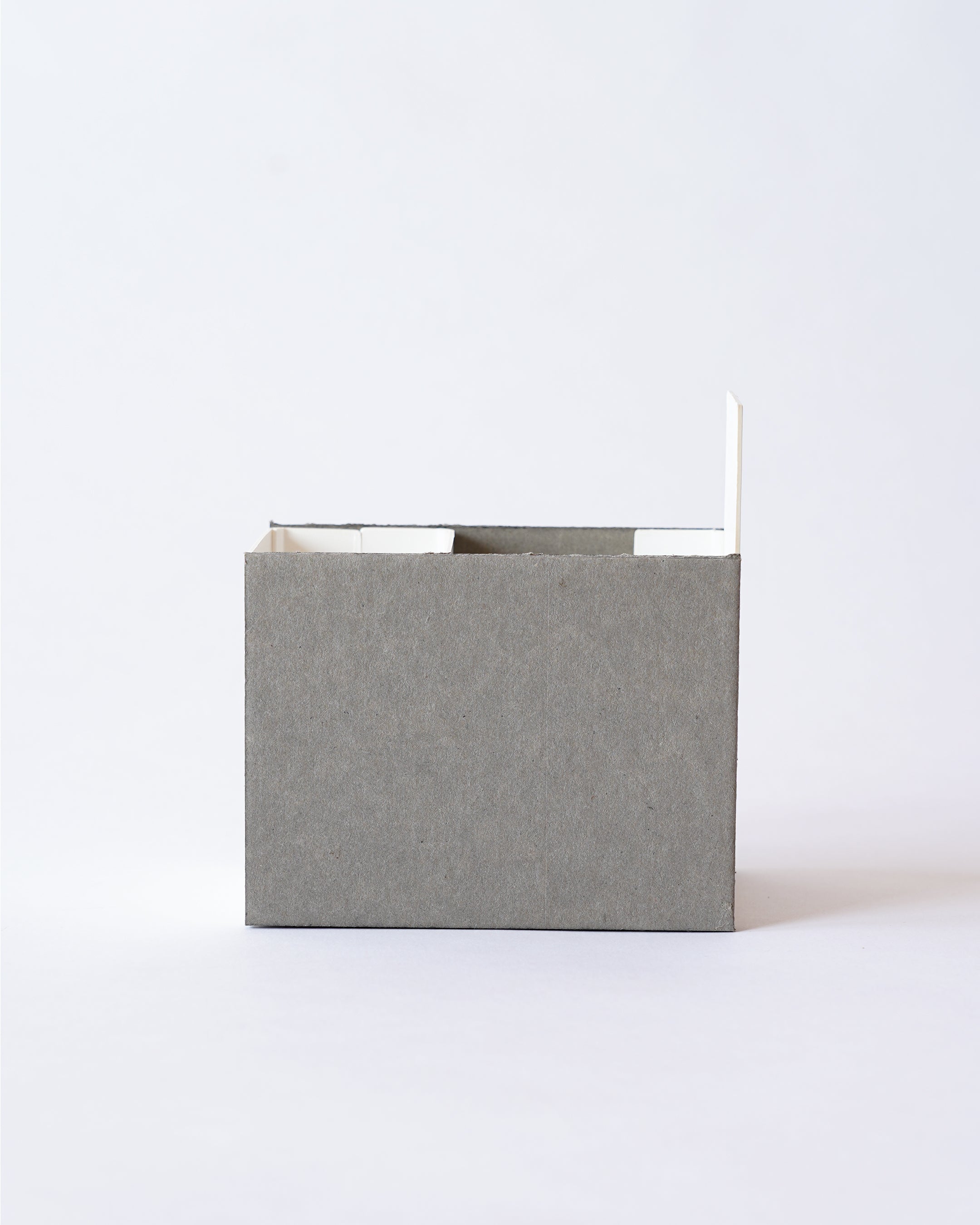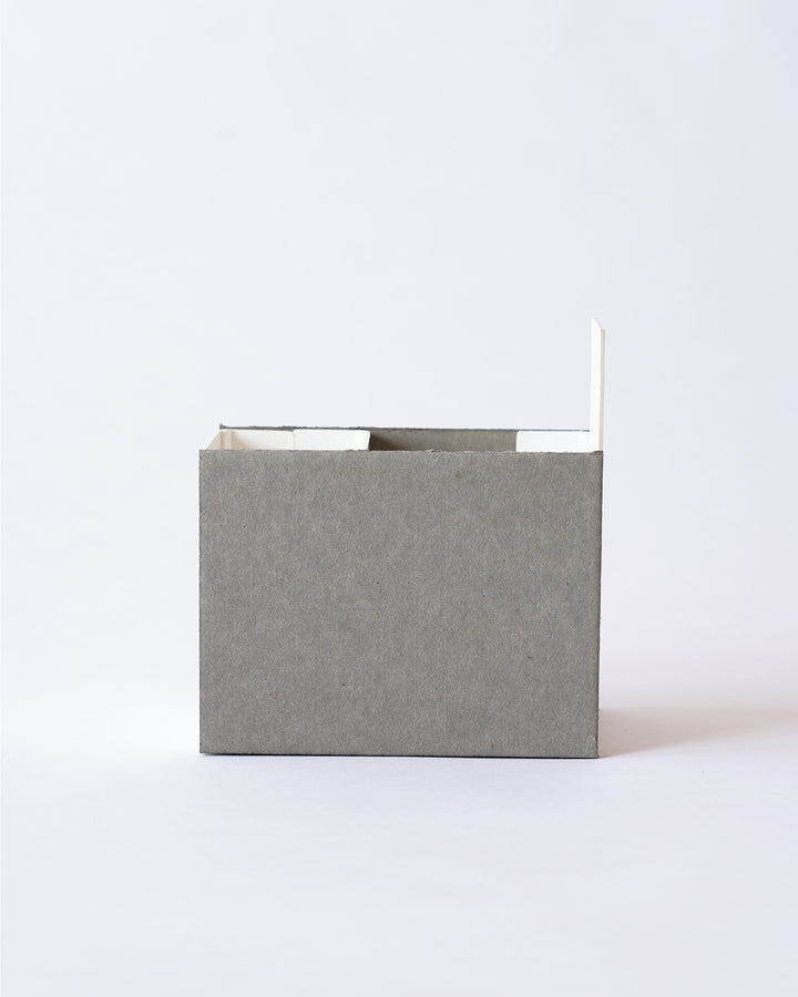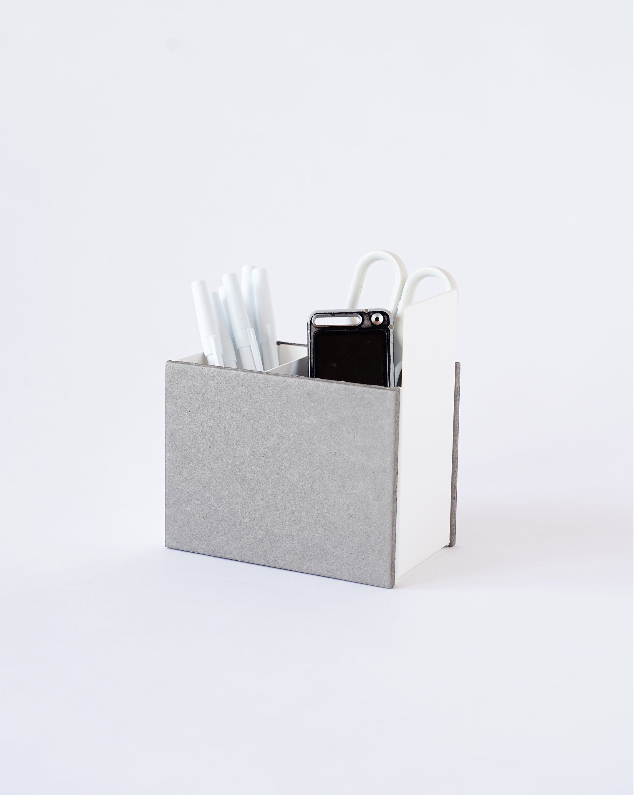 2種類の異なるパスコを張り合わせ組み立てたツールボックスです。「パスコ」とはヨーロッパで開発されたリサイクル可能な紙製繊維ボード。同種類でありながら厚みや色が異なる事により、木やプラスチック、スチールなどでは表現できない質感を表現。仕切りが設けられているので、散らばりがちなリモコンやペン類などをまとめて収納ができます。挟み込んだ厚さ5ミリのパスコは安定感もあり、端部にちょっとした取っ手がありますので持ち運びにも便利です。