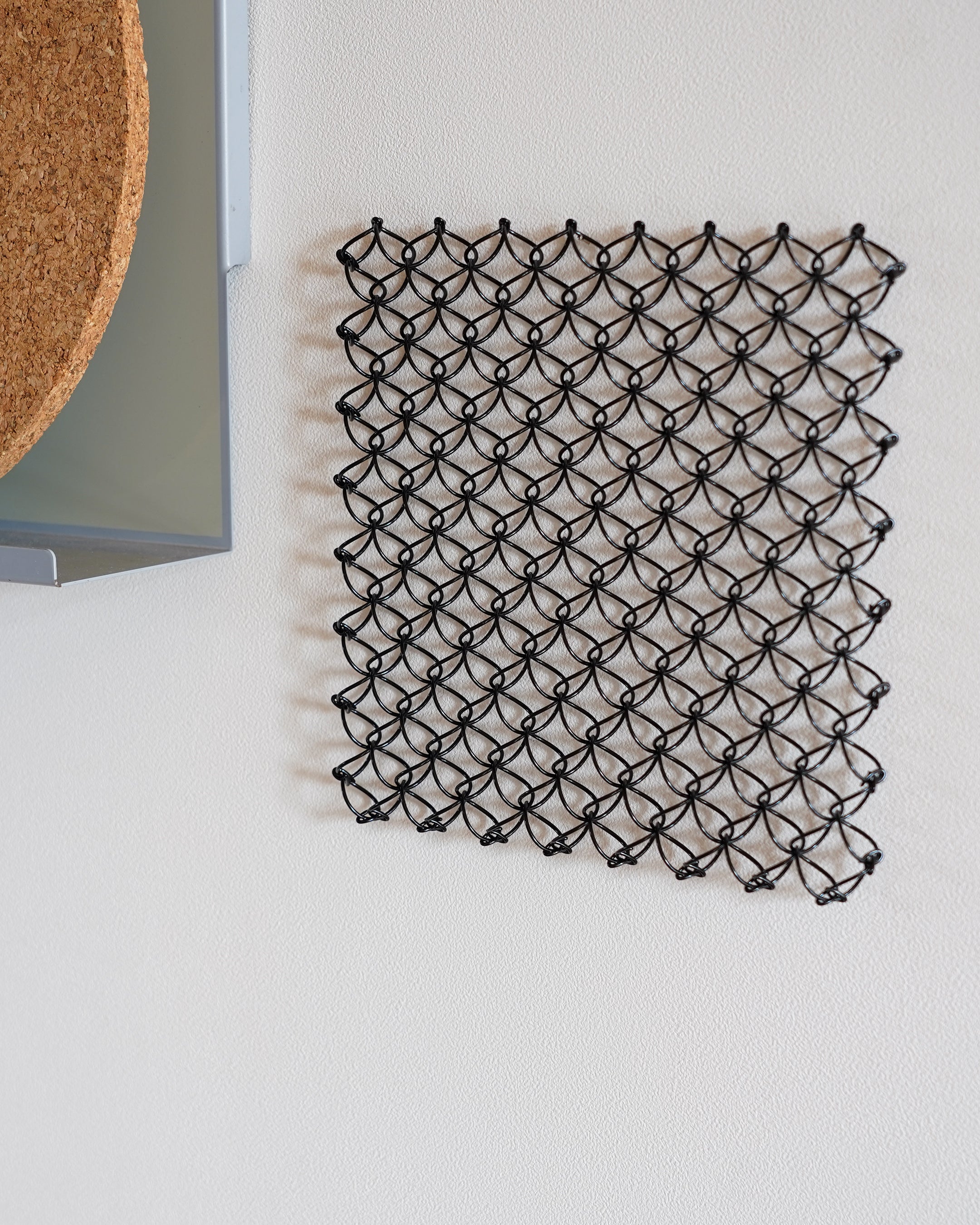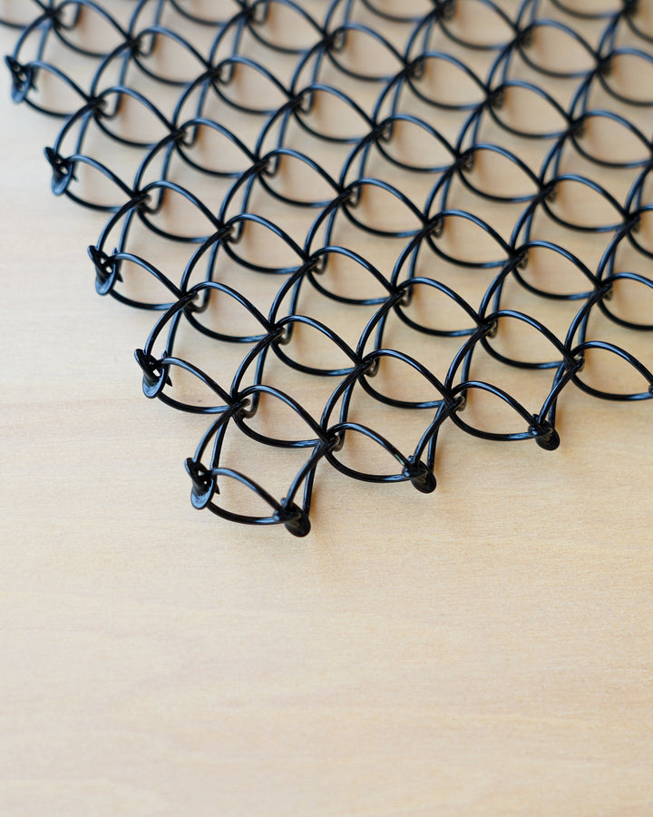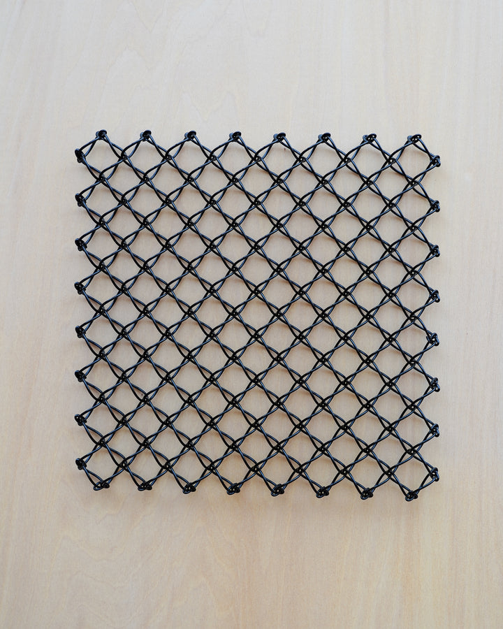 リズミカルな網目が美しい佇まいのワイヤー鍋敷き。高さが13ミリもあるのでワイヤーの間から熱が逃げやすい設計になっており、軽量のため自宅の他にキャンプなどにも重宝しそうなサイズ感です。用途と構造が美しく合致した工業製品は使っても飾っても贈り物にも良さそうです。ブラックはステンレスに塗装。