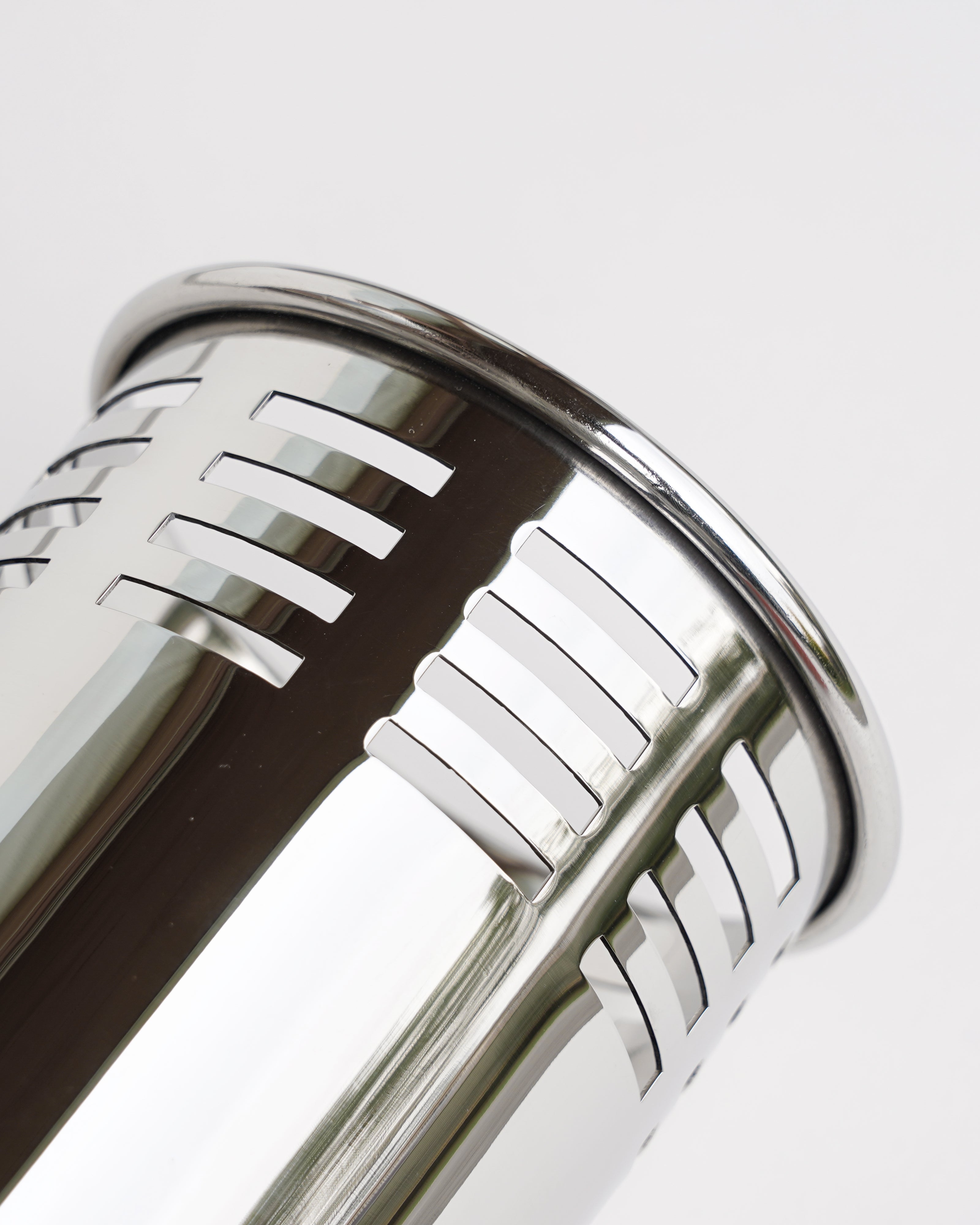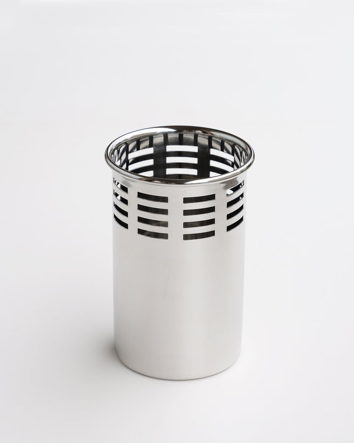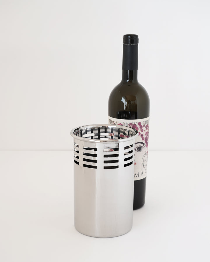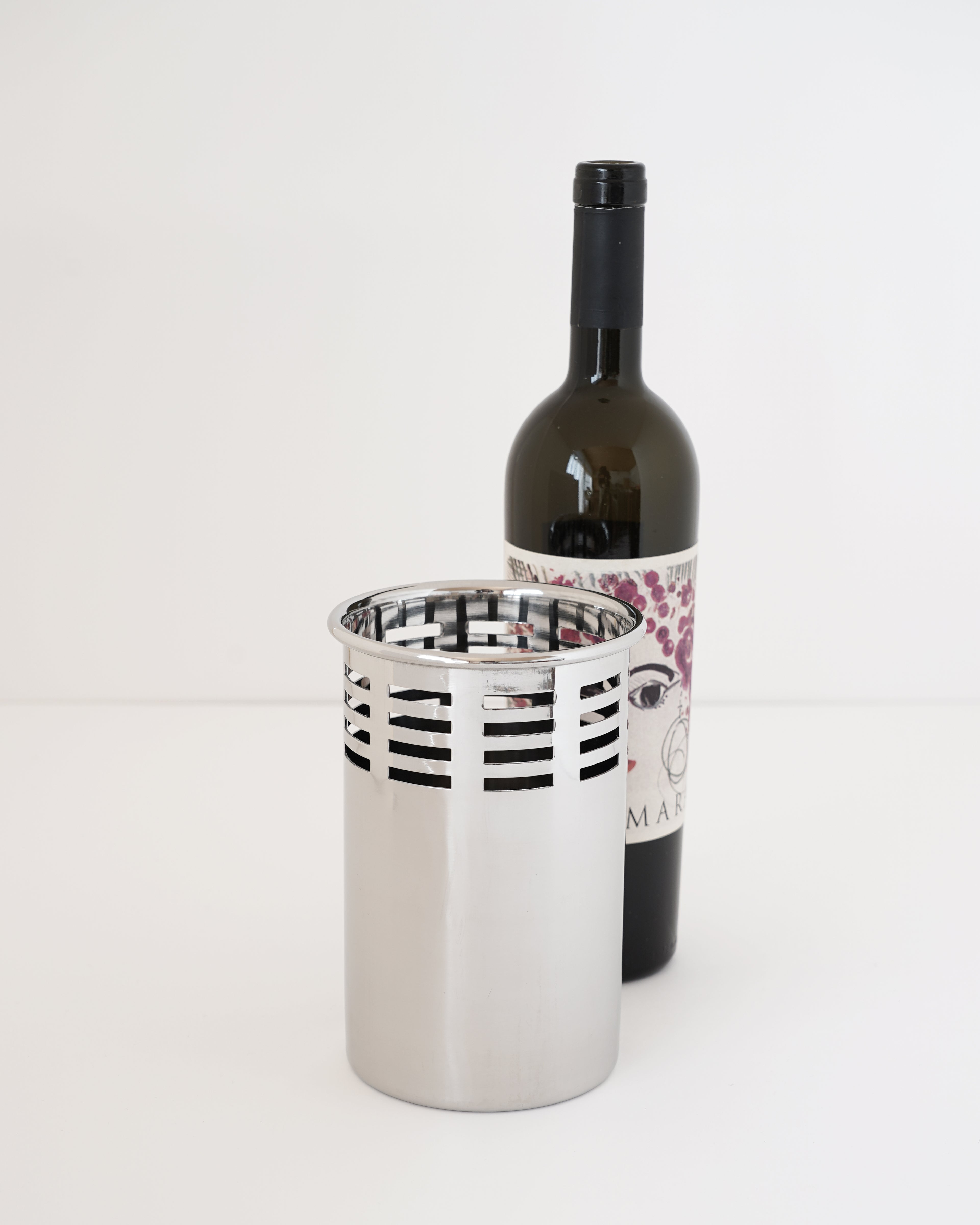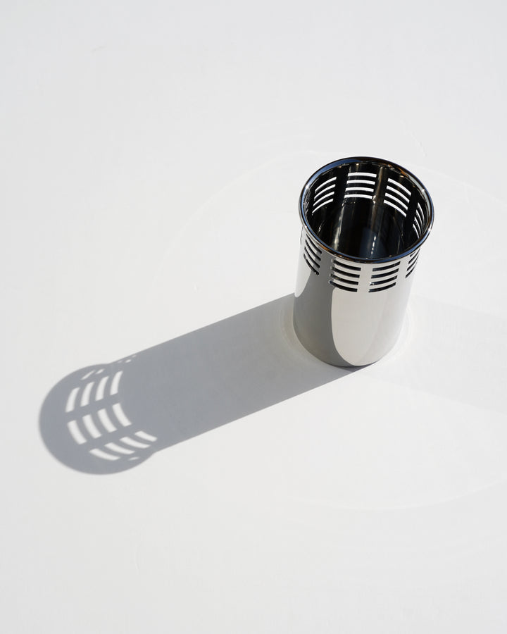 2004年にデザインされた「OFFERTA」はエットレ・ソットサスによってデザインされました。彼らしいシンプルで力強いフォルムに美しく配置された幾何学的模様が印象的で、上部が丸く肉厚に処理されており(指がかかり持ちやすくもある)、その佇まいはまるで美しい建築物のようです。イタリアのSerafino Zani社の職人気質な確かなクオリティと、ソットサスの"らしい“プロポーションは普遍的で最高レベルの工業製品に仕上がっています。用途名称はボトルホルダーとなっていますが、ドライフラワーを挿したり小物入れやツールスタンドなど自由にご利用頂けます。(皮肉はあるものの)過度に詩的過ぎず、あくまで工業製品やオブジェとして完全に成立しているソットサスらしいデザインです。(イタリア製、本国廃盤品になります。)
